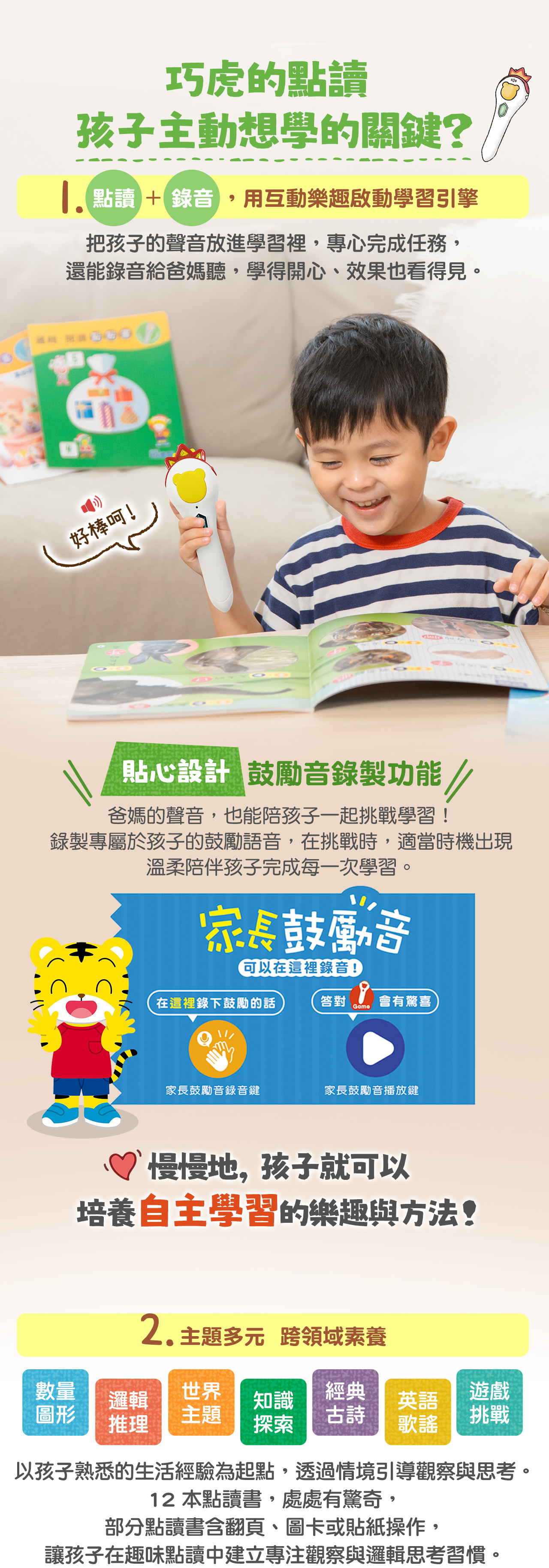 點讀 × 即時回饋互動,搭配跨領域豐富主題,讓坐不久的孩子也能專心探索,每天都有新發現