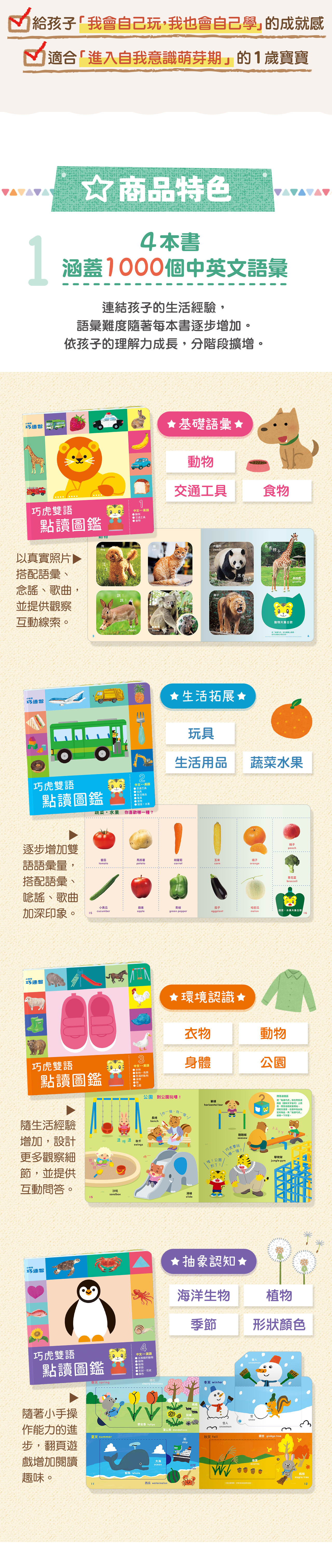 •五大潛能開發:透過 4 本主題圖鑑,涵蓋生活、動物、交通工具等範疇,提升觀察力、專注力與想像力等。