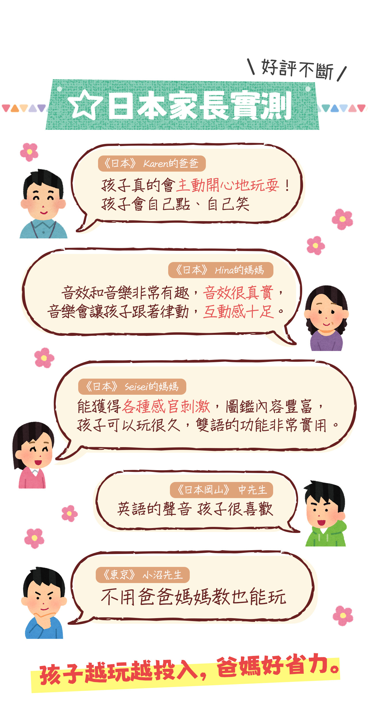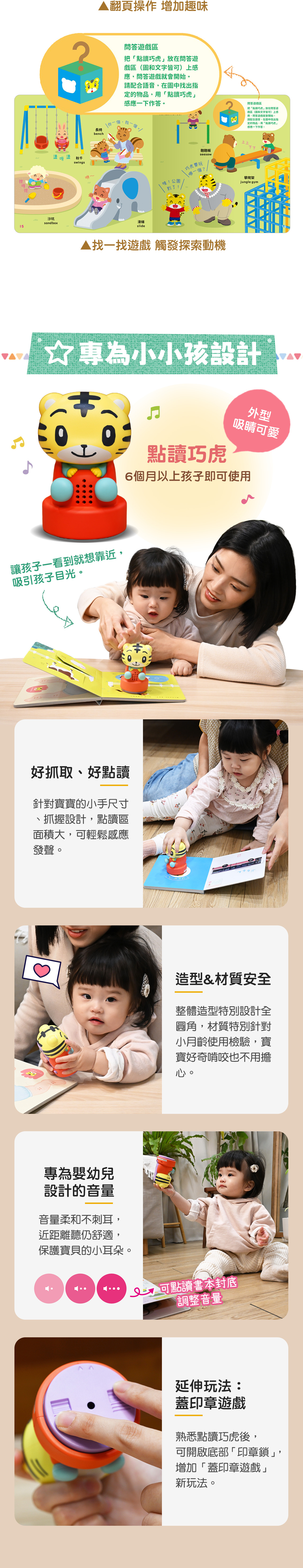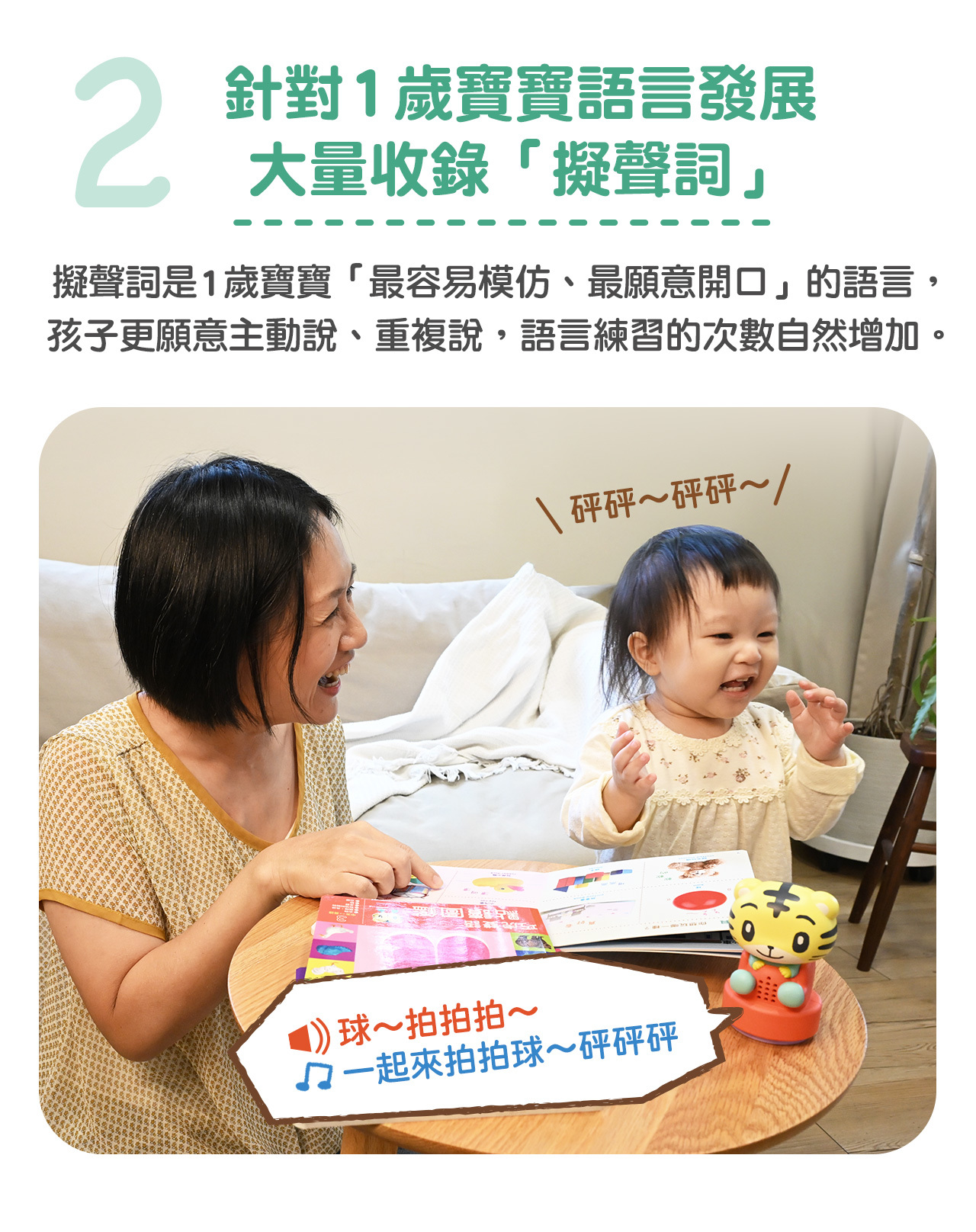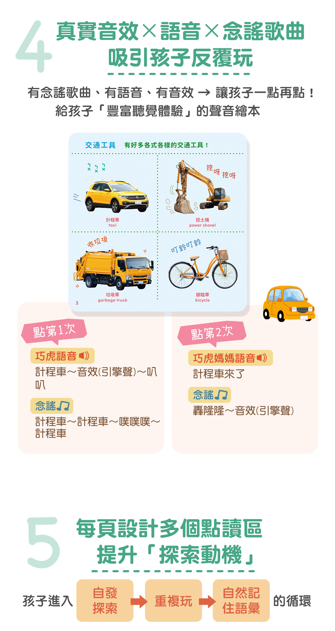 •真實音效+唸謠歌曲:內建高品質音效、唸謠說唱,強化寶寶圖像與現實環境的認知連結。