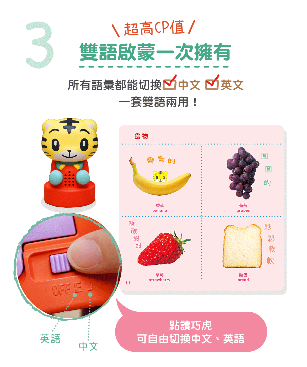 •中英雙語點讀:提供高品質中、英語音輸入,解決家長發音焦慮,在家建立自然語感環境。